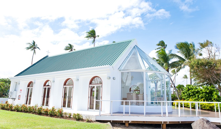 The resort's Seaside Chapel is located in a secluded area on our private island. Purpose-built, non-denominational, and air-conditioned, the chapel is perched on the water’s edge with a floor-to-ceiling glass wall facing the Ocean providing a perfect Pacific Island backdrop for an outdoor reception.